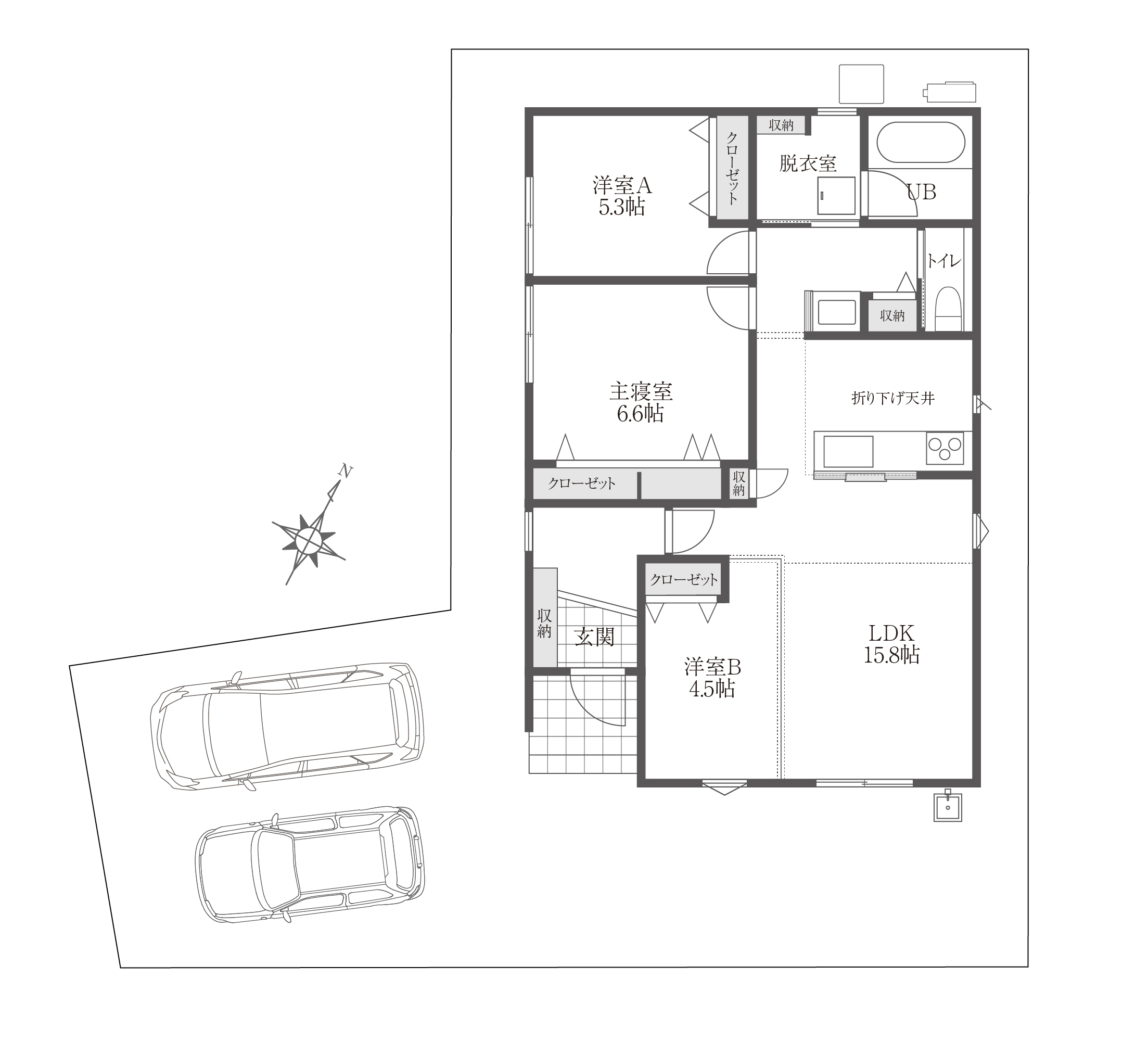 駐車2台が可能な約52坪の敷地で、