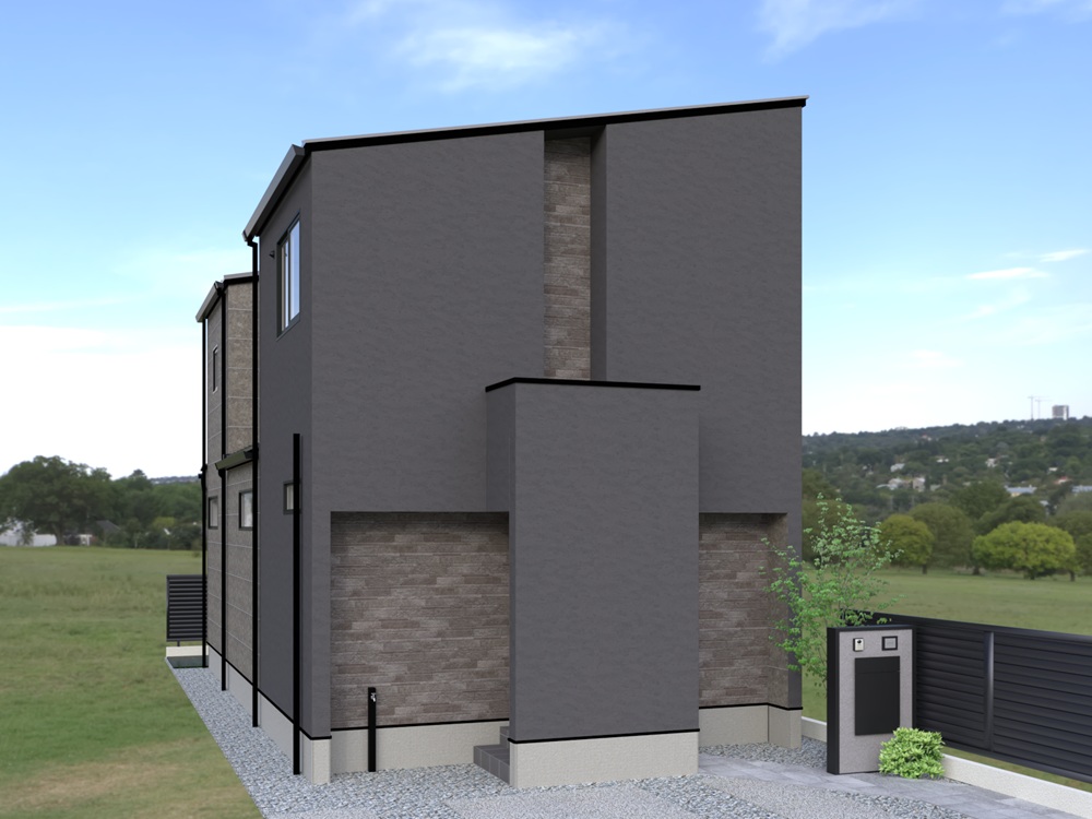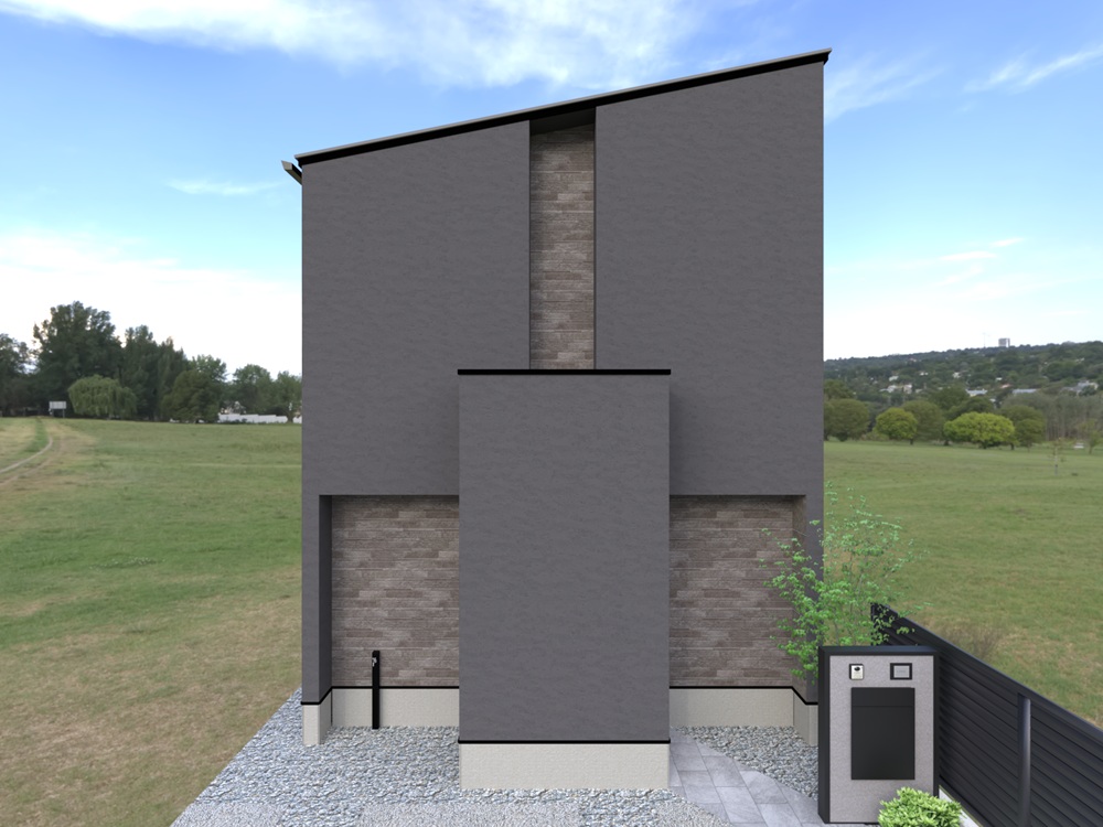 グレーを基調にジョリパットと2種類のサイディングを組み合わせ、ワントーンでも豊かな表情をデザインしました。玄関前に壁を立てることで、出入りの際に室内の様子が外に丸見えにならず、プライバシーを大切にしながら生活できます。