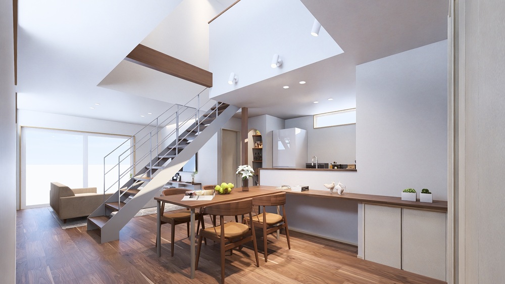 ウォルナット材の突板フローリングから感じる木の温もり、スケルトン階段と吹き抜けがもたらす開放感に包まれるLDKの心地よさを、ぜひ現地で体感してください。
