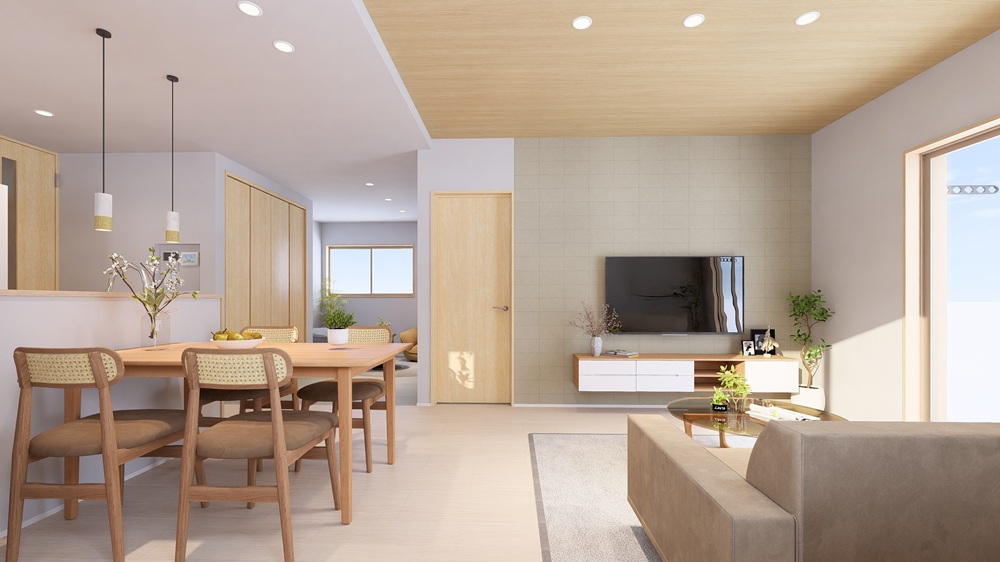 広々とした開放感あふれるリビング。家族が自然と集まる、ゆとりある空間設計です。