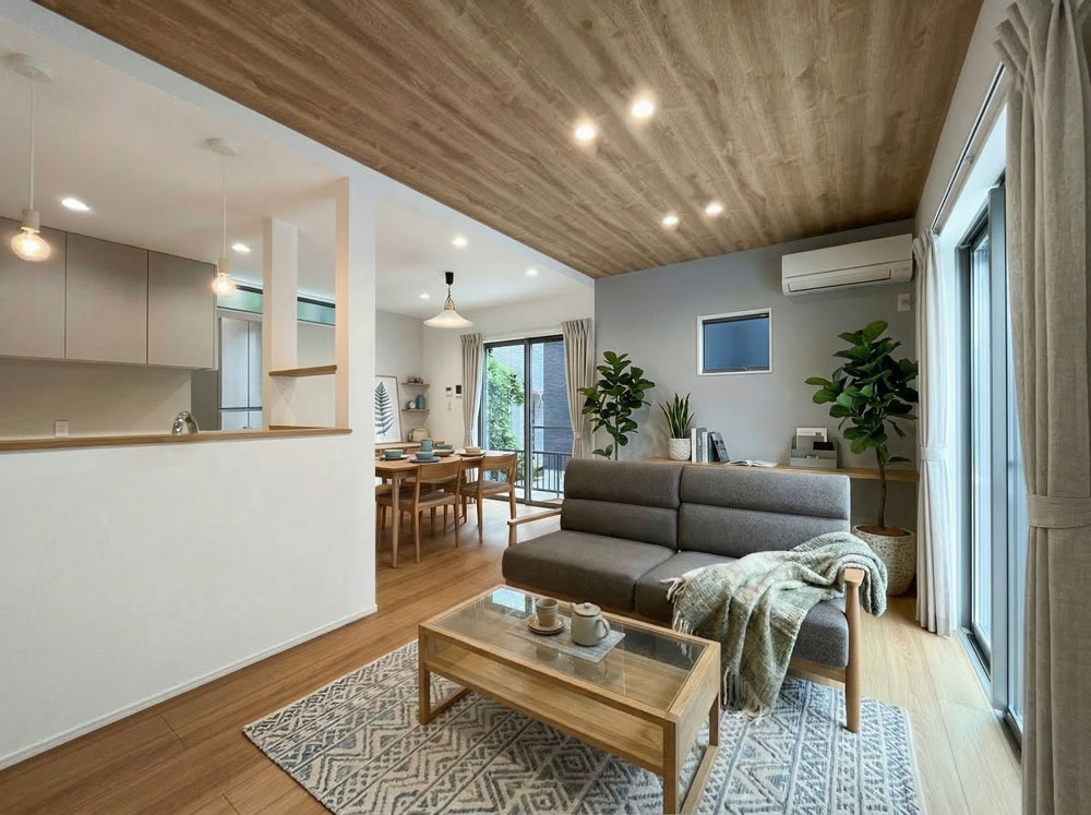 リビングの扉を開けると、木目柄クロスの高い天井が心地よい広がりを感じさせてくれます。