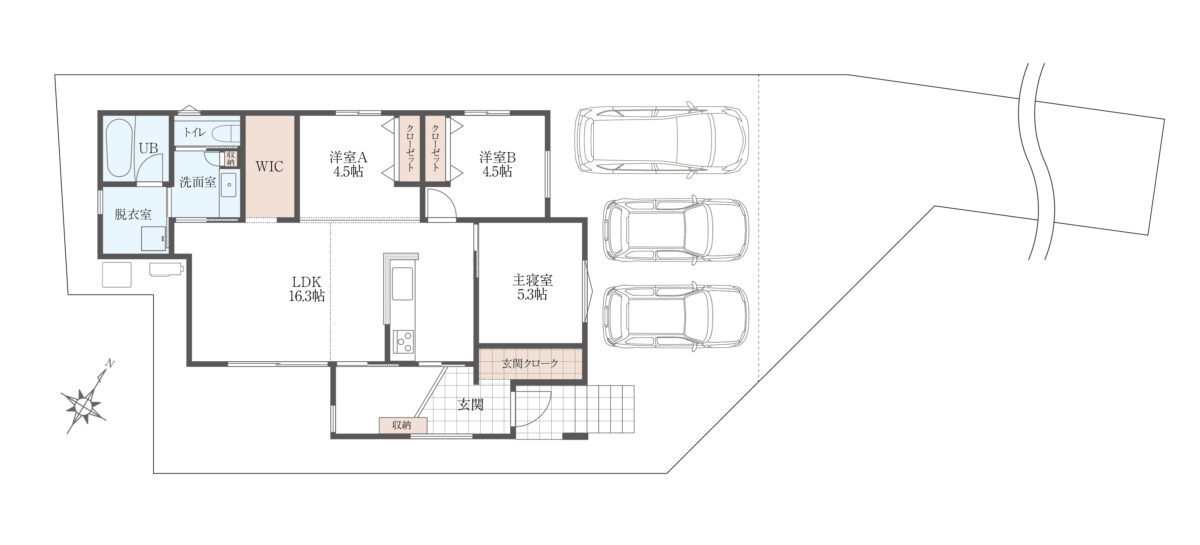 洗面脱衣に近いWIC - 最大駐車並列で3台可能