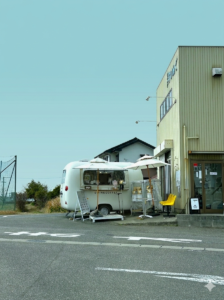 レトロで可愛い白いエアストリーム型のトレーラーで、青空の下に佇む姿がとってもお洒落。
