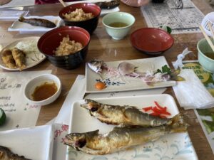 鮎の刺身、塩焼き2本、甘露煮、小鮎のフライ、鮎めしがついてきました。