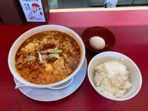 中辛ちぢれ麺の大盛りとたまごかけごはんセットを頼みました。