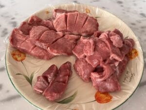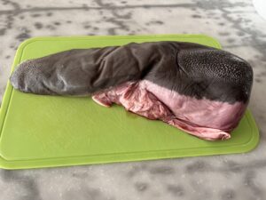 聞いたところ『牛の舌』『タン』でした。牛1頭分の舌でこの塊が日本円で