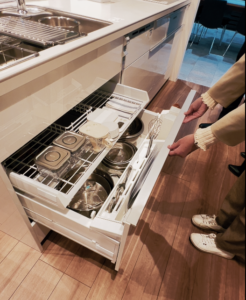 こちらのキッチンは引き出しがわざありで。
