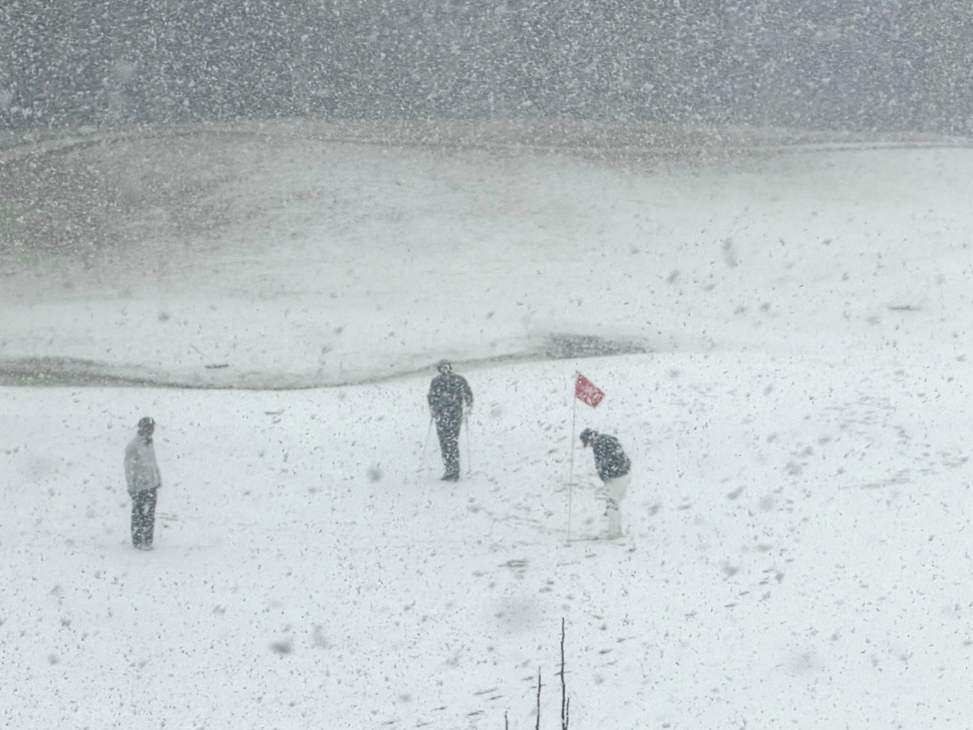 先頭の組は、雪で覆われたグリーンでパットに奮闘中で