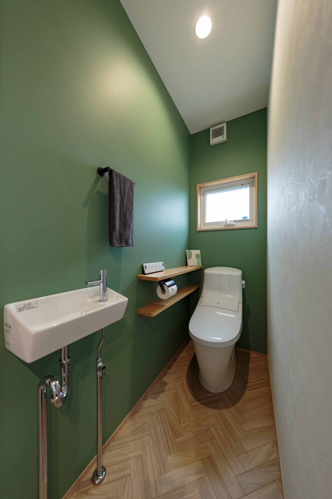帰宅後の動線上に設置したホールの手洗い。ご親戚・ご友人が訪れた際も、スムーズに手洗いを促せます。