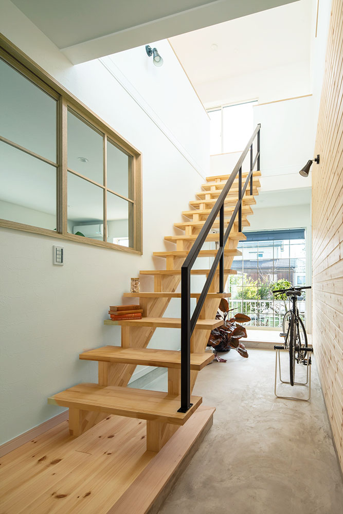 光が通り抜けるスケルトン階段で、玄関が明るく開放的です。
