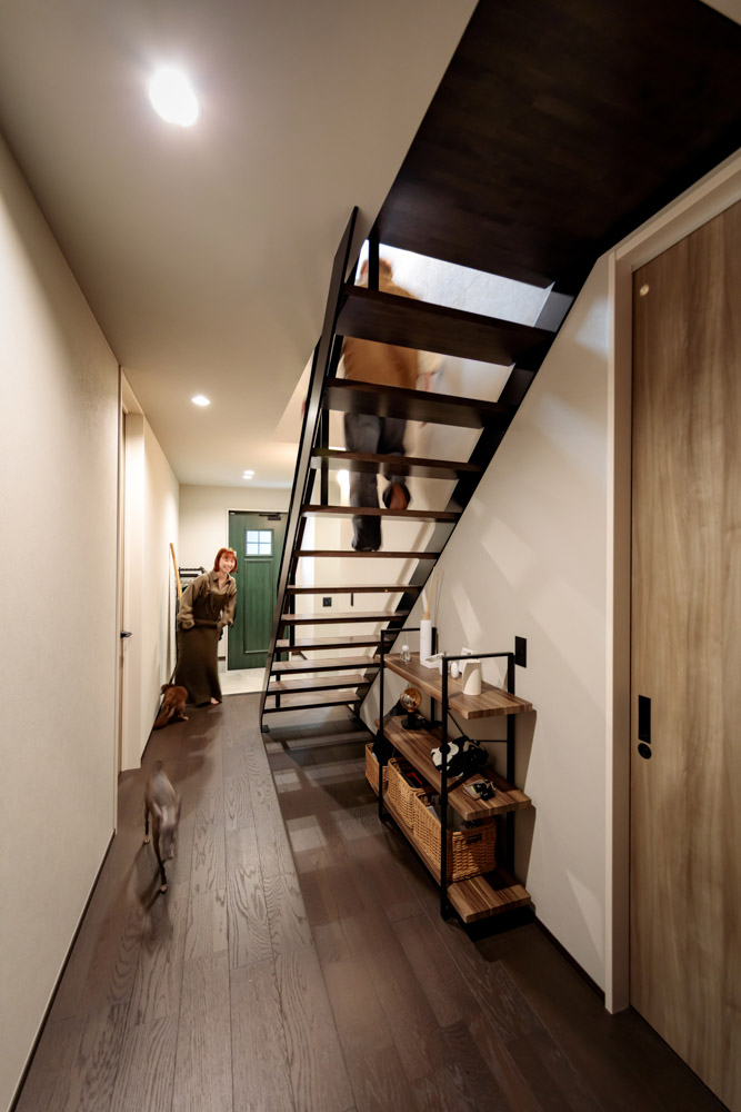 玄関ホールからまっすぐに伸びるスケルトン階段。2階リビングへのシームレスな動線を叶えました