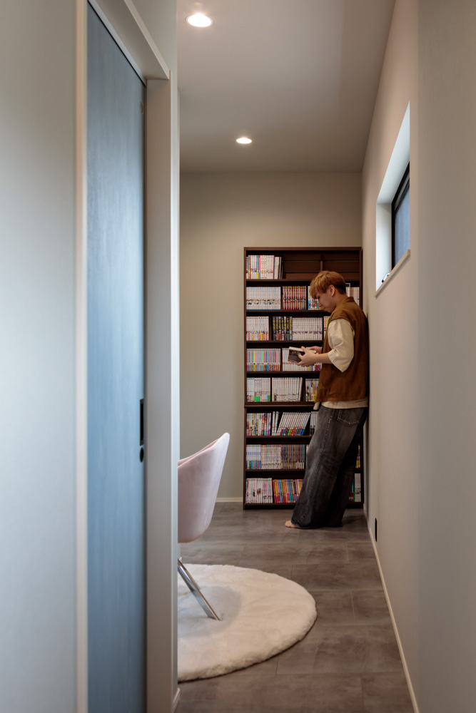 リビングとゆるやかにゾーニングされたおこもり感のある空間で、ご主人は漫画、奥さまはジグソーパズルにそれぞれ没頭するのも、趣味を大切にしているおふたりにとってなくてはならないひとときです。