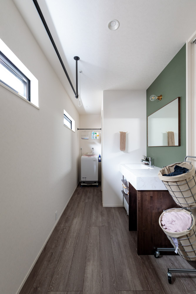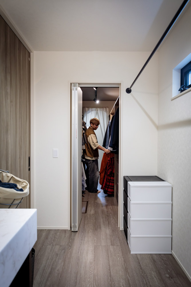 洗面室とウォークインクローゼットを1階に集約し、一直線上にレイアウトしたコンパクトな身支度動線。ヘアセットやメイクをしたら、そのままウォークインクローゼットに移動して洋服をトータルコーディネート。玄関の鏡で全身をチェックするのが、毎朝のルーティーンになっています。