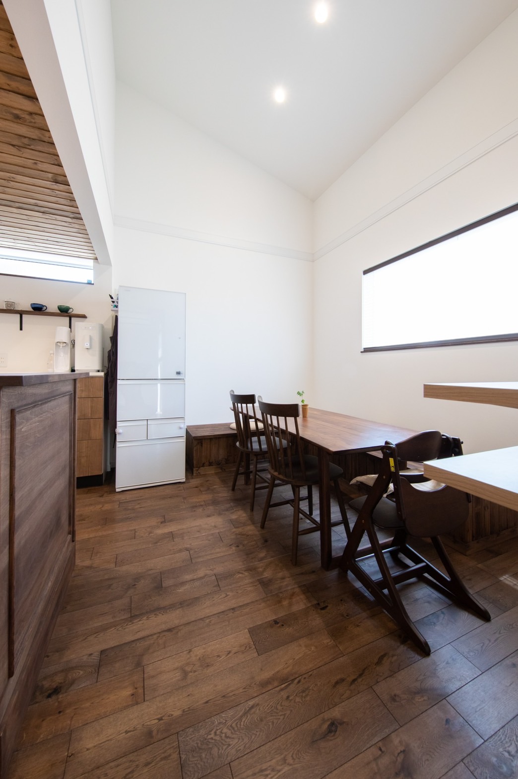 ダイニングの造作ベンチやキッチンのカップボードなど、収納力も抜群です。