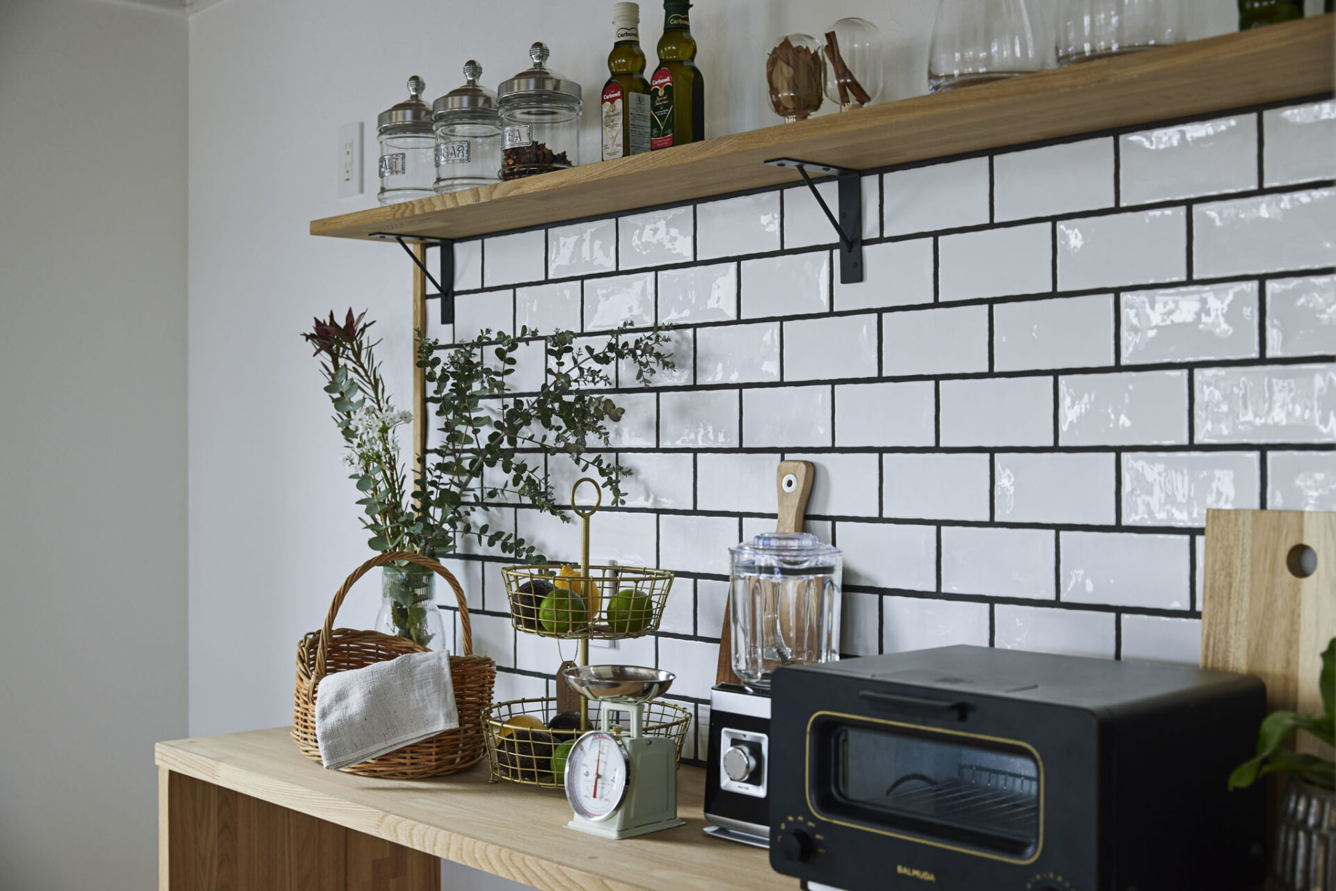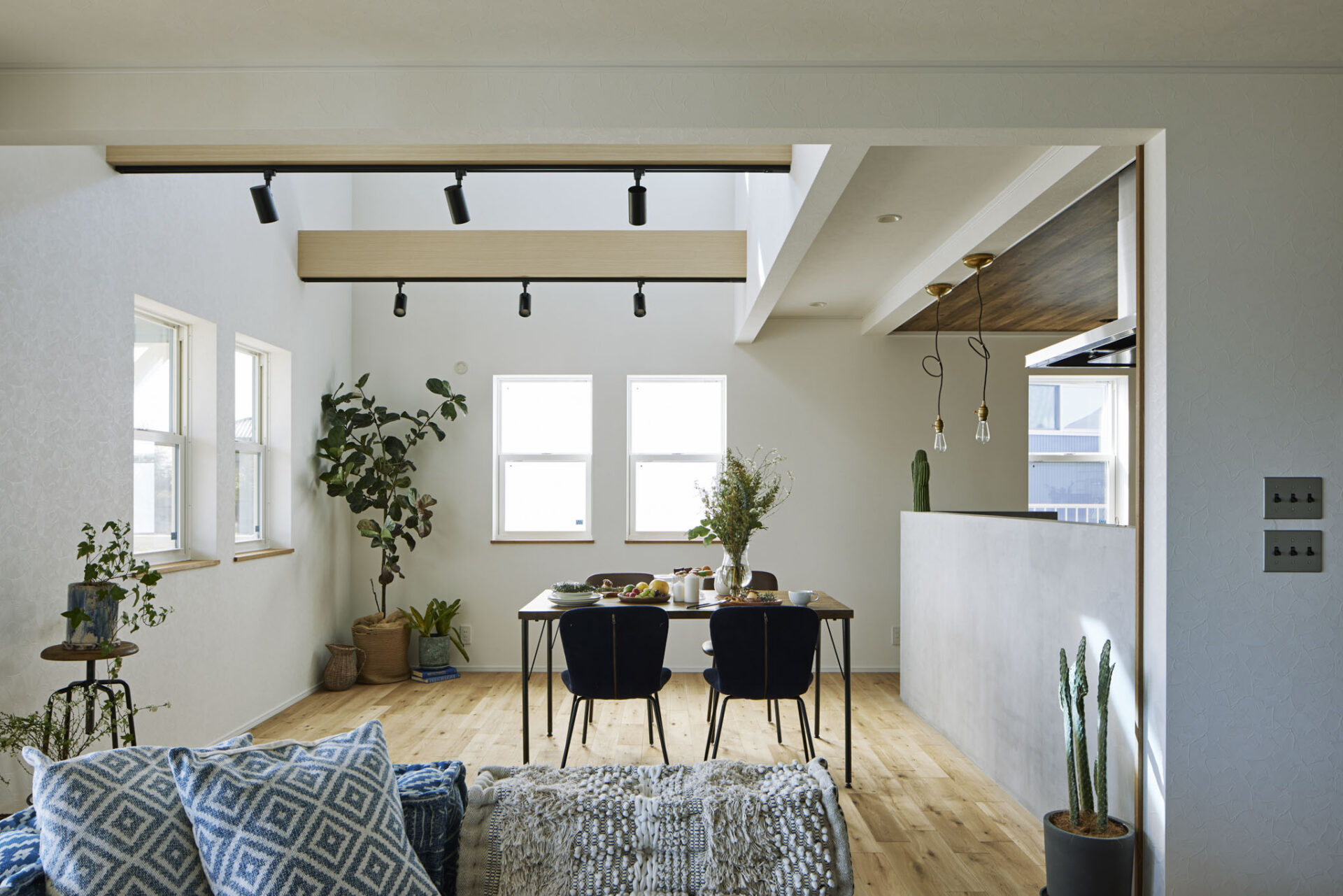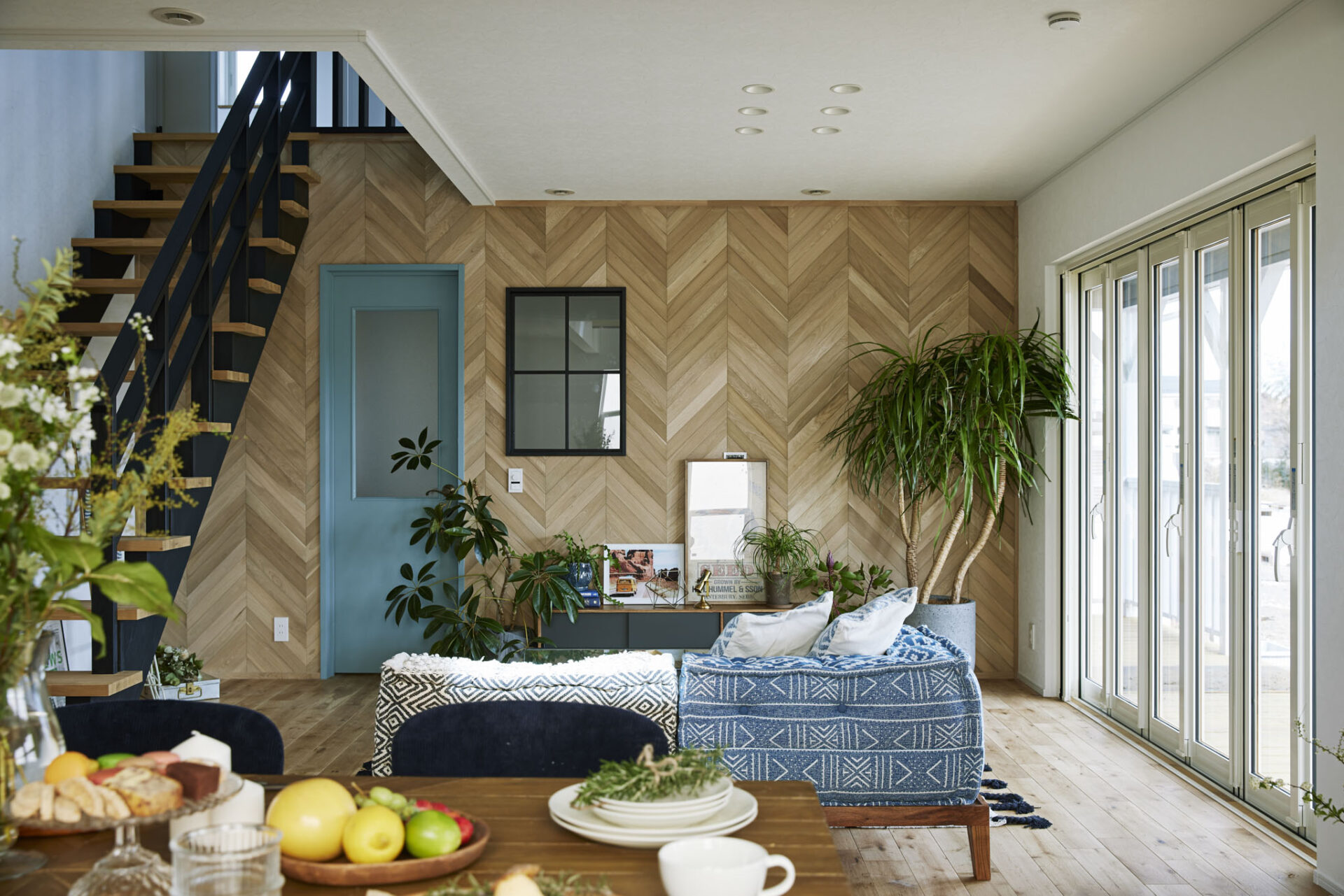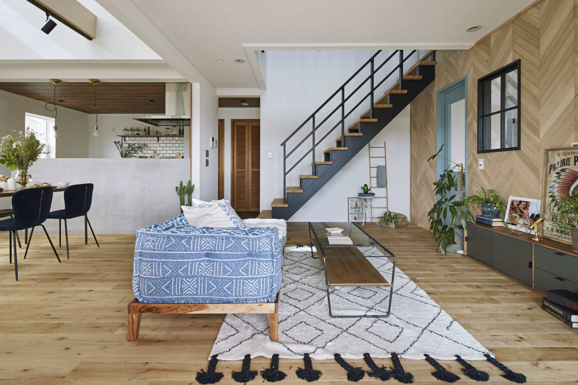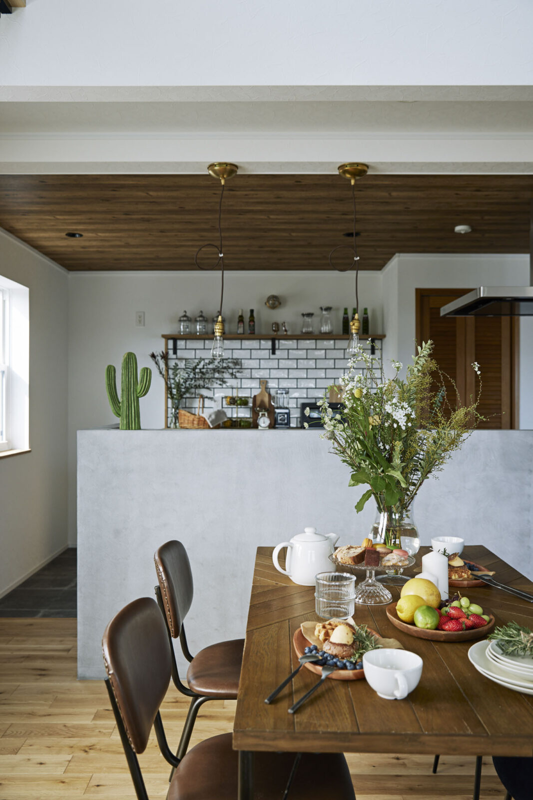 リビングの板張り、モールテックス仕上げの回遊型キッチンなど装飾もおしゃれ。