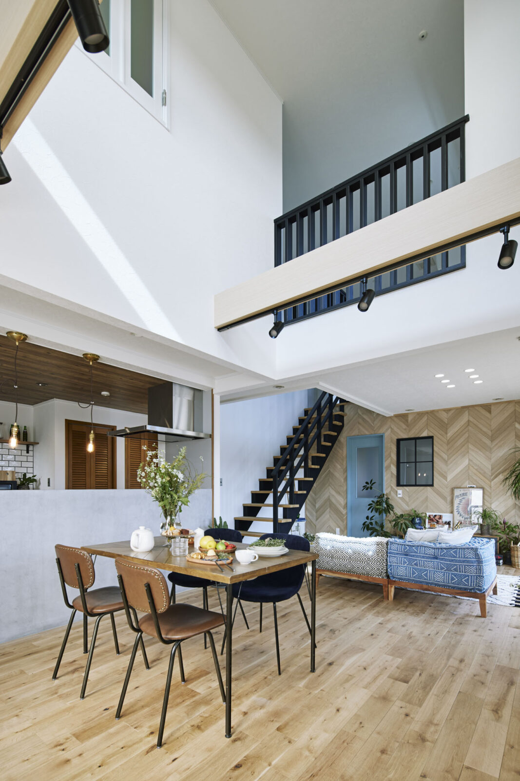 吹き抜けと23.8帖の広さで縦横に開放的なLDKは、