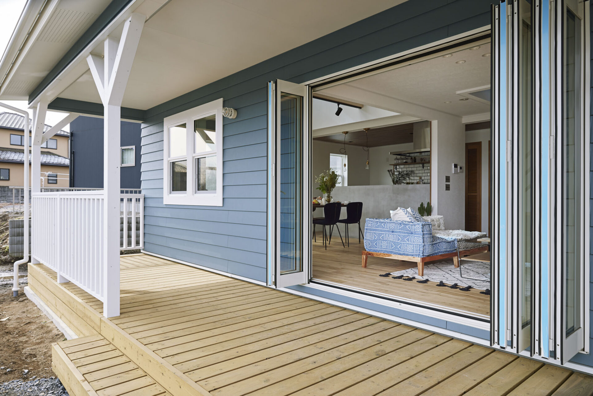 幅1.8mの広いウッドデッキは、ベンチやサイドテーブルを置いてアウトドアリビングに。